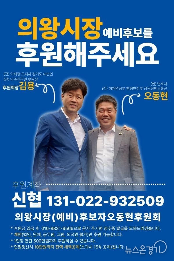 오동현 예비후보는 “전국적으로 승리의 바람을 일으키고 있는 김용 전 부원장의 선택이 틀리지 않았음을 증명하겠다”며 “강력한 연대로 반드시 승리해 의왕을 역동적인 변화의 현장으로 만들겠다”고 화답했다.정치권은 “김용 전 부원장이 의왕, 용인, 남양주, 고양 등 주요 지역 예비후보들의 후원회장으로 전면에 나선 것은 친명계의 결집과 지방선거 승리를 위한 강력한 ‘연대 전선’이 구축된 것을 의미한다”고 해석했다.한편, 오동현 예비후보 후원회는 오늘부터 공식 계좌(신협 131-022-932509 의왕시장(예비)후보자오동현후원회)를 통해 시민들의 자발적인 후원을 받으며 본격적인 선거 캠페인 확산에 주력할 예정이다.