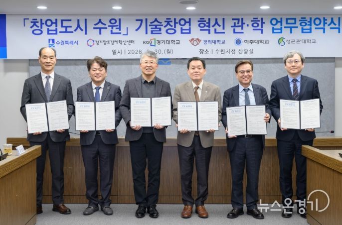수원시와 경기창조경제혁신센터, 4개 대학은 30일 시청 상황실에서 ‘창업도시 수원 기술창업 혁신 관·학 업무협약’을 체결하고, 협력을 약속했다.