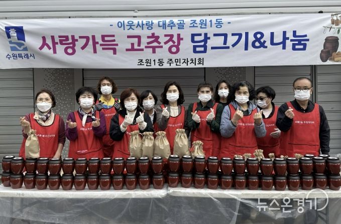 뉴스온경기 | 수원시 장안구 조원1동 주민자치회는 지난 1일, 복지행정분과 주관으로 ‘사랑가득 고추장 담그기’ 행사를 열고, 직접 담근 고추장을 관내 취약가구 200여 세대에 전달했다.