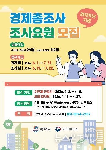 뉴스온경기 | 평택시는 오는 8일부터 23일까지 ‘2025년 기준 경제총조사’ 현장 조사 업무를 담당할 조사요원을 모집한다.