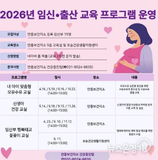 뉴스온경기 | 평택시 안중보건지소는 관내 임산부들의 건강한 출산을 돕고 체계적인 육아 정보를 제공하기 위해 ‘2026년 임신․출산 교육 프로그램’을 본격 운영한다고 밝혔다.
