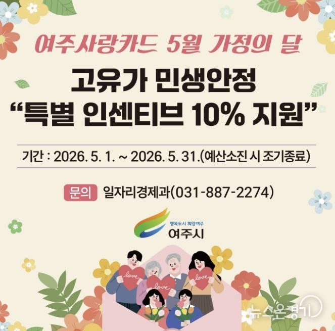 뉴스온경기 | 여주시는 최근 중동 정세 악화에 따른 물가상승 압력이 높아짐에 따라 민생안정 대책으로 오는 5월 가정의 달 ‘여주사랑카드 특별 인센티브 10%’ 지원을 한다고 밝혔다.