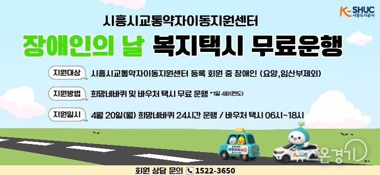 뉴스온경기 | 시흥도시공사는 오는 4월 20일 ‘제46회 장애인의 날’을 맞아 교통약자의 이동 편의 증진과 사회참여 확대를 위해 무료 운행 서비스를 제공한다고 밝혔다.