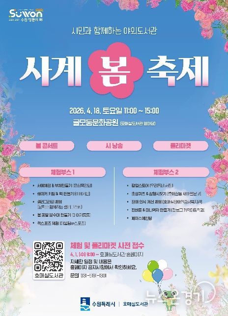 뉴스온경기 | 수원시 호매실도서관은 18일 글모둠문화공원(호매실도서관 옆 마당)에서 봄 콘서트와 시 낭송, 체험부스와 플리마켓 등으로 구성한 ‘사계-봄 축제’를 연다.