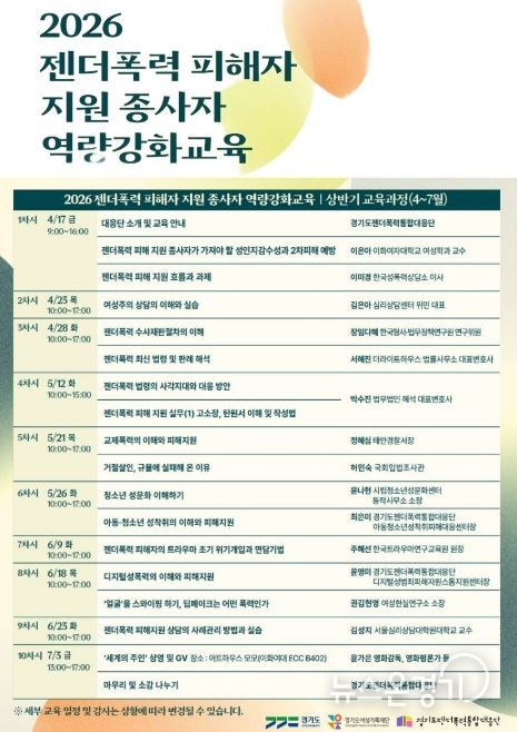 뉴스온경기 | 경기도와 경기도젠더폭력통합대응단이 17일 도내 젠더폭력 피해 지원 현장 종사자들의 전문성 향상을 위한 ‘2026 역량강화 교육’ 상반기 과정을 시작하며 현장 대응력 강화에 나섰다.