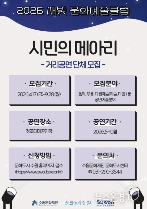 뉴스온경기 | 수원문화재단은 지역 공연예술의 활성화와 수원시민의 주체적 문화예술 참여를 위해 ‘새빛 문화예술클럽 '시민의 메아리'’ 사업에 참여할 생활예술단체를 모집한다.