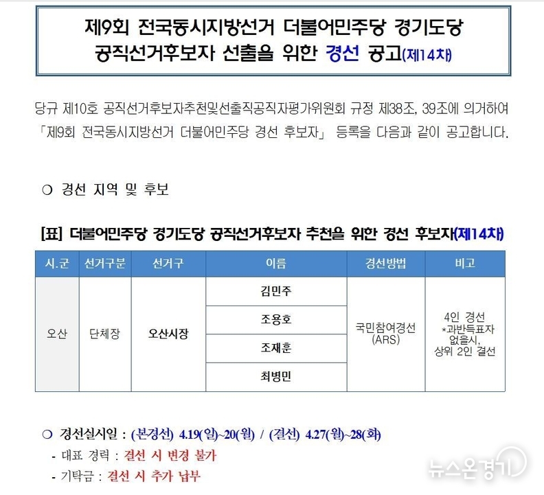 이로서 민주당 오산시장 경선은 다시 김민주, 조용호, 조재훈, 최병민 후보의 4자 경선이 됐다.