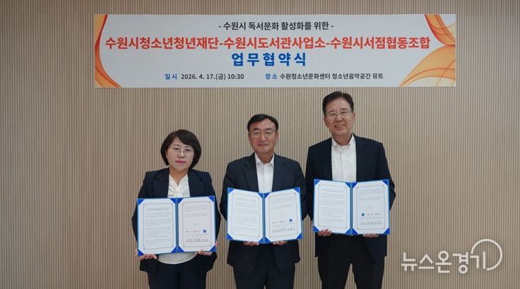 뉴스온경기 | 수원시청소년청년재단은 수원시도서관사업소, 수원시서점협동조합과 4월 17일 수원청소년문화센터에서 수원시 독서문화 활성화를 위한 업무협약을 체결했다.