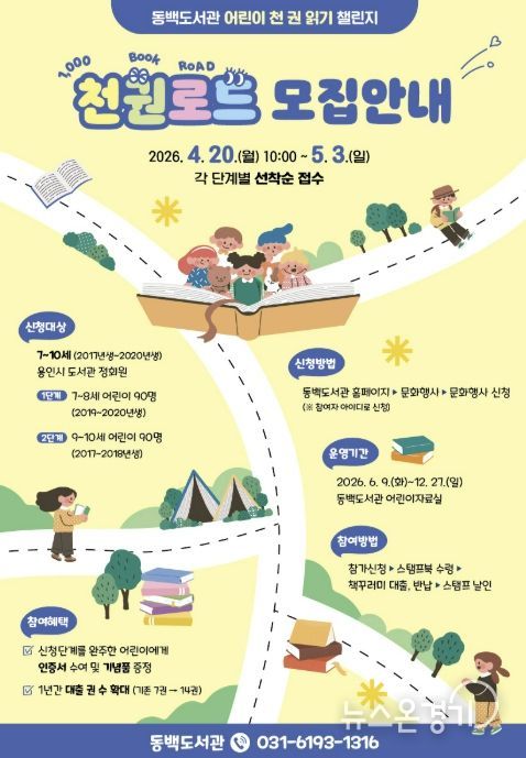 뉴스온경기 | 용인특례시 동백도서관은 어린이 천 권 읽기 챌린지 ‘천권로드(ROAD)’ 참여자를 모집한다고 20일 밝혔다.