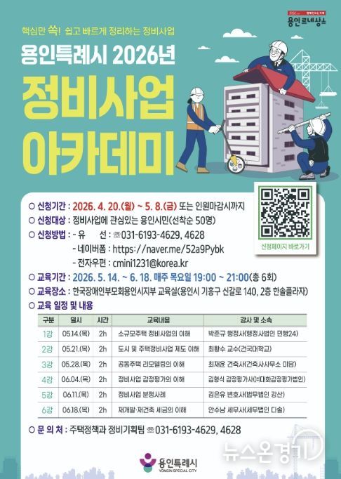 뉴스온경기 | 용인특례시는 4월 20일부터 5월 8일까지 ‘2026년 정비사업 아카데미’ 수강생을 모집한다.