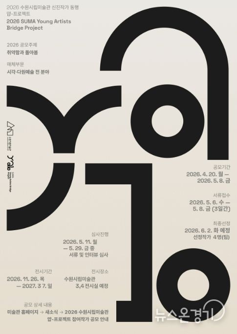 뉴스온경기 | 경기도 수원시립미술관은 신진작가 발굴 및 창작 지원을 위한 공모 사업‘신진작가 동행 얍-프로젝트(YAB-Project)’를 개최하고 4월 20일부터 5월 8일까지 참여자 모집 공고를 시작한다. 서류 접수는 5월 6일부터 5월 8일 오후 6시까지 이메일을 통해 진행된다.