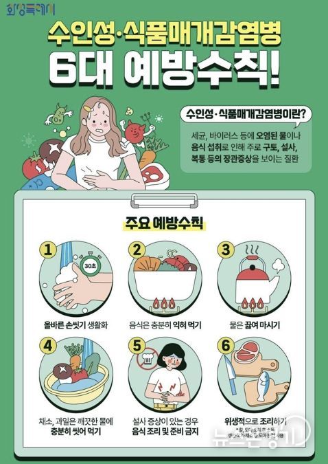 이에 시는 수인성·식품매개감염병 예방을 위한 6대 수칙을 적극 홍보하고 있다. 주요 내용은 ▲흐르는 물에 비누로 30초 이상 손 씻기 ▲음식은 중심부까지 충분히 익혀 먹기(육류 75℃, 어패류 85℃) ▲물은 끓여 마시기 ▲채소와 과일은 깨끗한 물에 씻어 먹기 ▲설사 증상 시 음식 조리 금지 ▲조리기구 용도 구분 등이다.