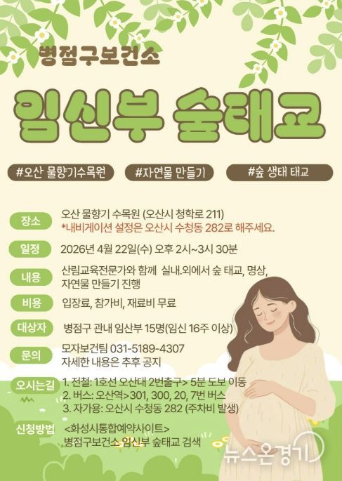 뉴스온경기 | 화성특례시 병점구보건소는 임신부의 정서적 안정과 건강한 출산을 지원하기 위해 오는 22일 ‘임신부 숲태교 프로그램’을 운영한다고 밝혔다.