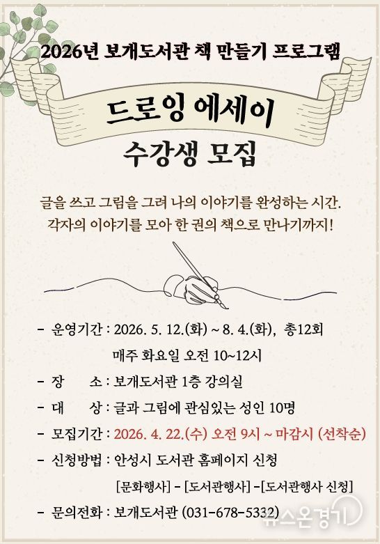 뉴스온경기 | 안성시 보개도서관(책문화센터)이 시민들의 창작 활동을 지원하고 일상 속 예술 경험을 확대하기 위해 오는 5월부터 ‘드로잉 에세이’와 ‘포토 에세이’ 책 만들기 프로그램을 새롭게 운영한다고 밝혔다.