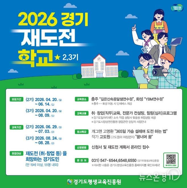 뉴스온경기 | 경기도와 경기도평생교육진흥원은 취업이나 창업 실패를 경험한 도민의 재기를 지원하기 위해 오는 20일부터 ‘2026년 경기 재도전학교’ 2~3기 참가자를 각각 55명 내외로 모집한다.