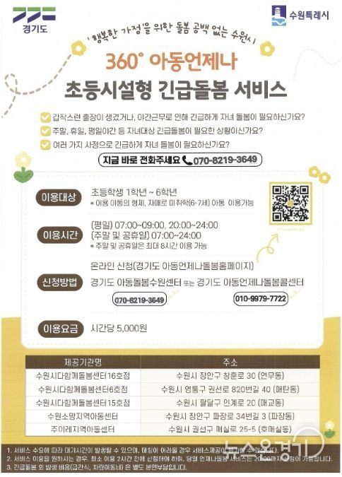 ‘초등시설형 긴급돌봄 서비스’는 갑자기 아동 돌봄이 필요할 때 요긴하다. 예상하지 못했던 출장이나 야근으로 퇴근이 예정보다 늦어지는 경우와 같은 돌발 상황에 모두 이용할 수 있다. 주말이나 휴일, 자정까지의 야간 시간 등은 물론 등교 전인 오전 7시부터 서비스를 제공한다. 장안구 2곳(연무동, 파장동), 권선구 1곳(호매실동), 팔달구 1곳(매교동), 영통구 1곳(매탄동) 등 총 5개 돌봄 기관에서 최대 8시간을 맡아준다. 경기도 아동언제나돌봄 홈페이지에서 온라인 신청할 수 있고, 경기도아동돌봄수원센터에 전화 신청할 수도 있다. 이용요금은 시간당 5천원이다.