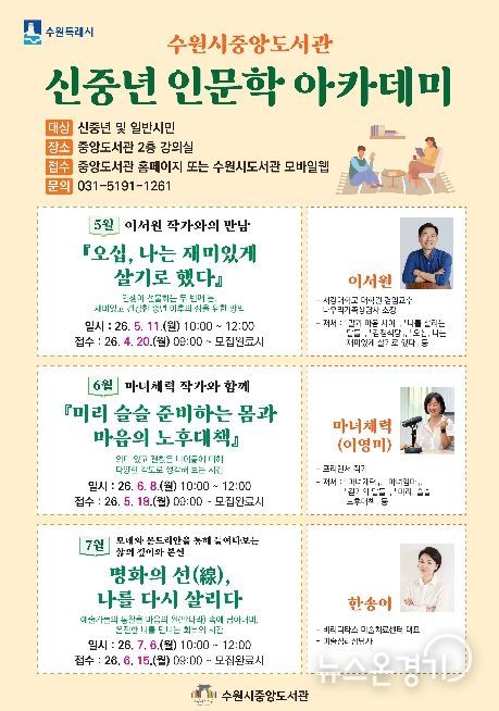 뉴스온경기 | 수원시 중앙도서관이 5월부터 7월까지 매달 1회 운영하는 ‘신중년 인문학 아카데미’ 수강생을 모집한다.