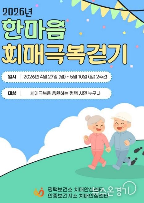 뉴스온경기 | 평택보건소 치매안심센터와 안중보건지소 치매안심센터에서는 지역 주민의 치매 예방과 인식개선을 위해 녪년 한마음 치매극복 걷기 행사’를 오는 4월 27일부터 5월 10일까지 2주간 진행한다.