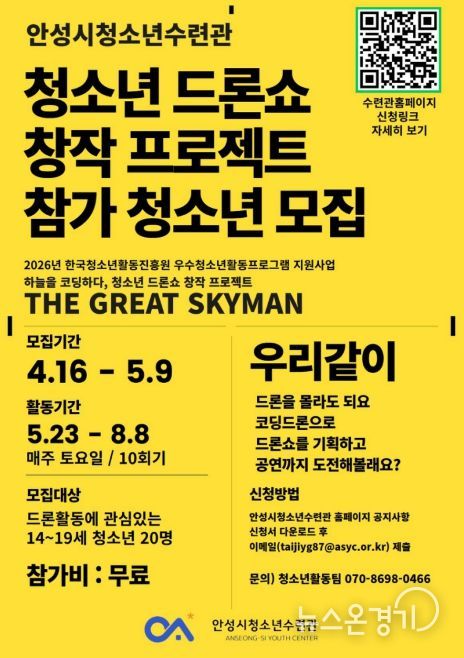 뉴스온경기 | 안성시청소년수련관은 미래 디지털 인재 양성을 위한 청소년 참여형 프로그램 '하늘을 코딩하다, 청소년 드론쇼 창작 프로젝트 ‘THE GREAT SKYMAN’'에 참여할 청소년을 4월 16일 ~ 5월 8일까지 모집한다고 밝혔다.