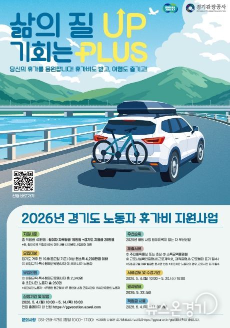 지원 방식은 노동자가 스스로 15만 원을 적립하면 경기도가 25만 원을 추가로 매칭 지원해 총 40만 원 상당의 휴가비를 마련해 주는 형태다. 선정된 노동자는 전용 온라인몰에서 적립금을 활용해 숙박권, 관광지 입장권, 문화예술 체험 등 다양한 맞춤형 휴가 상품을 자유롭게 이용할 수 있다.