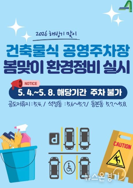 뉴스온경기 | 안성시시설관리공단은 해빙기를 맞아 공영주차장 이용객들에게 더욱 쾌적하고 안전한 주차 환경을 제공하기 위해 오는 5월 4일부터 8일까지 관내 건축물식 공영주차장 3개소를 대상으로 환경정비를 실시한다고 밝혔다.