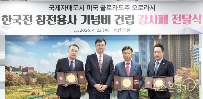 뉴스온경기 | 성남시가 22일 오후 2시 미국 콜로라도주 오로라시의 ‘한국전 참전용사 기념비’ 건립에 기여한 공로를 인정받아 오로라시 한국전참전용사기념비건립위원회로부터 감사패를 받았다.