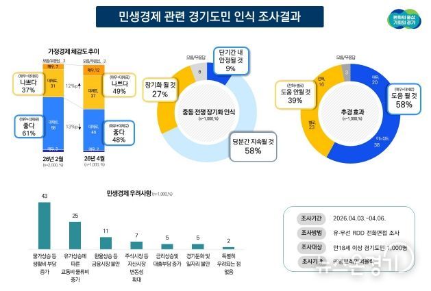 정두석 경기도 기획조정실장은 “가정 경제 형편이 두 달 만에 급격히 나빠졌다는 조사 결과는 현재 민생 현장의 어려움을 보여준다”며 “추경 예산이 빠르게 집행될 수 있도록 도의회와 긴밀히 협의하여 고유가와 고물가로 고통받는 도민들의 부담을 덜어드리도록 하겠다”고 밝혔다.