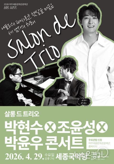 뉴스온경기 | 여주세종문화관광재단이 오는 29일, 문화가 있는 날을 맞아 2026년 특별기획 살롱 시리즈의 세 번째 무대 '살롱 드 트리오 박현수X조윤성X박윤우 콘서트'를 세종국악당에서 개최한다.
