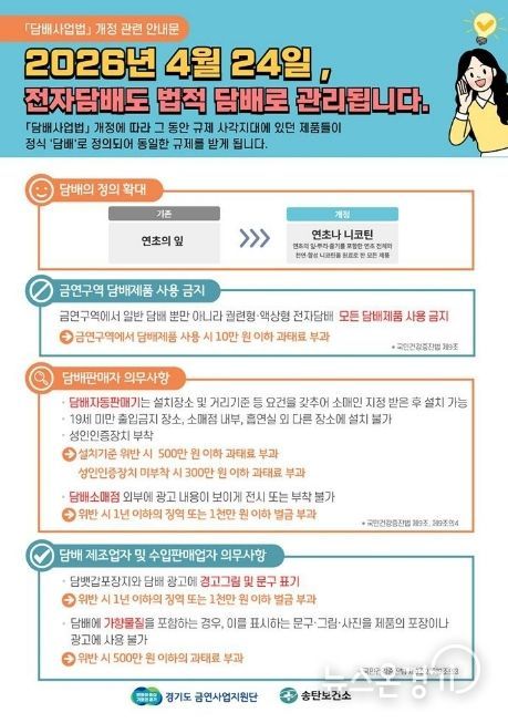 뉴스온경기 | 평택시는 2026년 4월 24일부터 시행되는 개정 '담배사업법'에 따라 전자담배를 포함한 모든 니코틴 제품이 ‘담배’로 규정되며, 금연구역 내 전자담배 흡연 시 과태료 10만 원이 부과된다고 밝혔다.