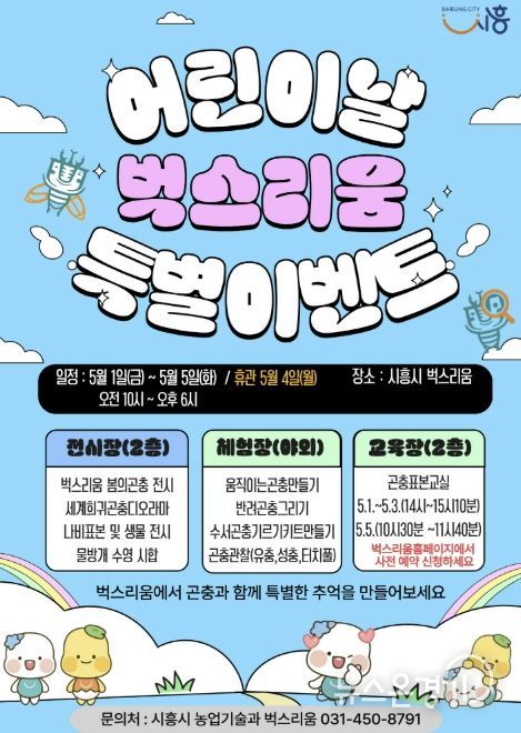 뉴스온경기 | 시흥시 곤충체험전시관 ‘벅스리움’은 어린이날을 맞아 아동과 가족이 함께 즐길 수 있는 ‘특별 프로그램’을 오는 5월 1일부터 5일까지 운영한다.