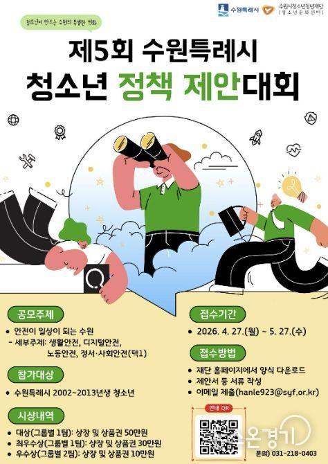 뉴스온경기 | 수원시청소년청년재단 수원청소년문화센터는 청소년이 정책을 기획하고 제안하는 ‘제5회 수원특례시 청소년 정책 제안대회’ 참가팀을 4월 27일부터 5월 27일까지 모집한다.