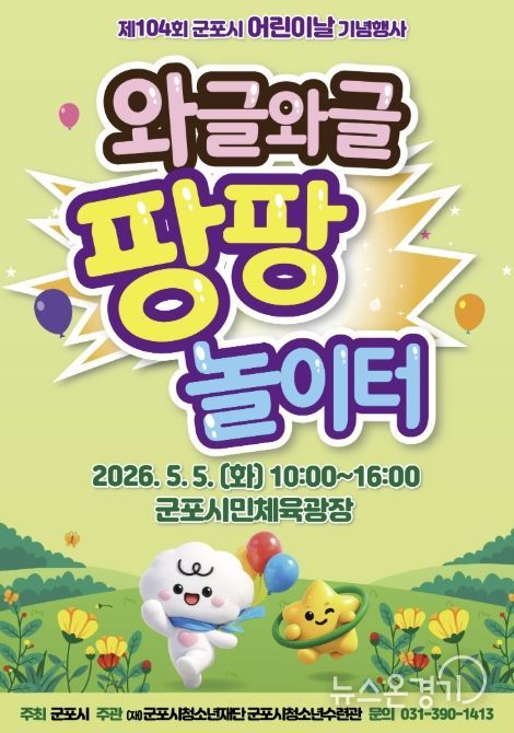뉴스온경기 | 군포시는 제104회 어린이날을 맞아 오는 5월 5일 오전 10시부터 오후 4시까지 군포시민체육광장에서 ‘와글와글 팡팡 놀이터’를 주제로 어린이날 기념행사를 개최한다.