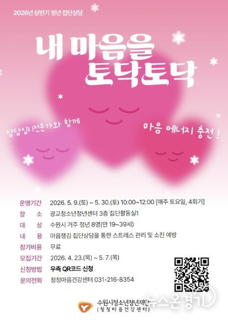 뉴스온경기 | 수원시청소년청년재단 청청마음건강센터는 학업과 취업준비, 직장생활 등 경쟁 중심 환경으로 인해 심리적 소진을 겪는 관내 청년들을 대상으로, 오는 5월 7일까지 전문가가 참여하는 집단상담 프로그램 ‘내 마음을 토닥토닥’ 참가자를 모집한다고 밝혔다.
