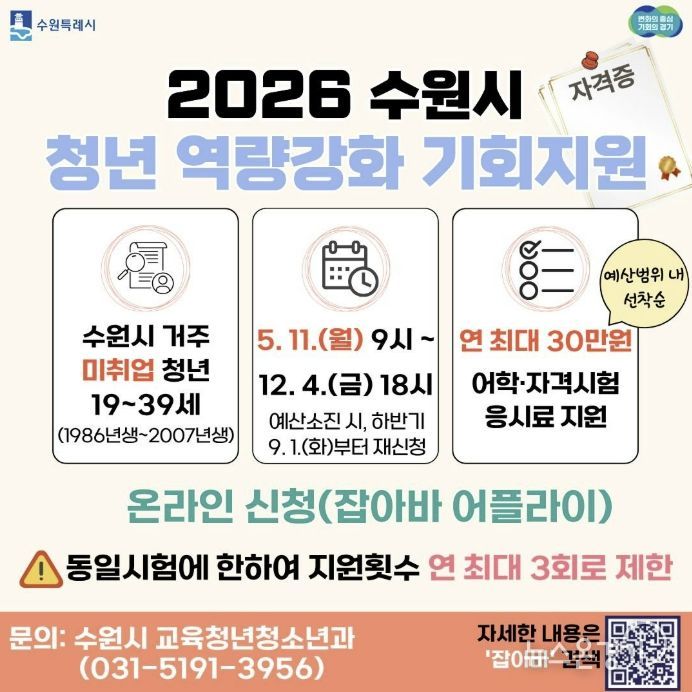 뉴스온경기 | 수원특례시는 미취업 청년의 취업 준비 비용 부담을 덜어주는 ‘청년 역량강화 기회 지원 사업’을 12월 4일까지 운영한다. 미취업 청년에게 어학·자격시험 응시료를 1인당 연 최대 30만 원 지원한다.