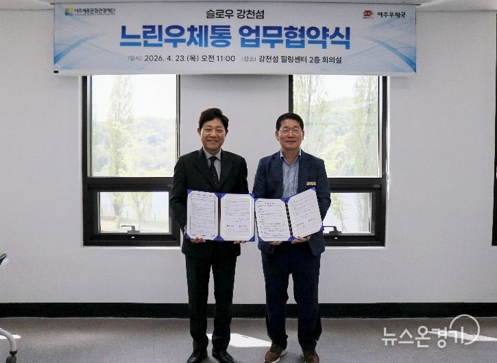 뉴스온경기 | 여주세종문화관광재단과 여주우체국은 4월 23일 강천섬 힐링센터에서 ‘슬로우 강천섬 느린우체통 업무협약(MOU)’을 체결했다. 빠르게 흘러가는 일상 속에서 잠시 걸음을 멈추고, 소중한 사람에게 미래의 마음을 전할 수 있는 감성 관광콘텐츠를 공동으로 운영하기 위해서다.