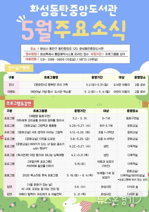 뉴스온경기 | 화성동탄중앙도서관이 어린이날과 가정의 달을 맞아 5월 한 달간 도서관 이용자와 시민을 대상으로 자료실과 3층 공공의 마당 등에서 다양한 문화행사를 운영한다.