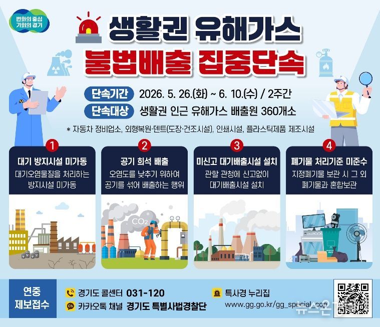 뉴스온경기 | 경기도 특별사법경찰단이 5월 26일부터 6월 10일까지 2주간 주거지·학교·병원 등 생활권 인근 지역의 유해가스 배출 사업장을 대상으로 불법행위를 집중단속 한다.