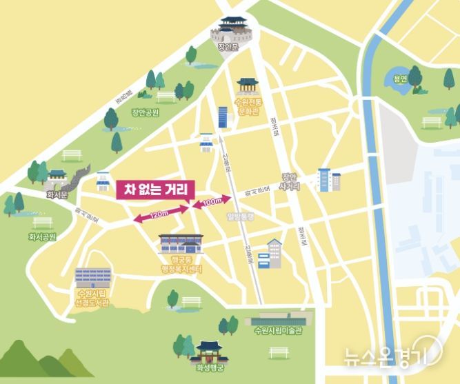 뉴스온경기 | 수원시 행궁동 화서문로 34번지부터 신풍로 47번지까지 약 220m 구간이 5월부터 매주 토요일 ‘차 없는 거리’로 운영된다.