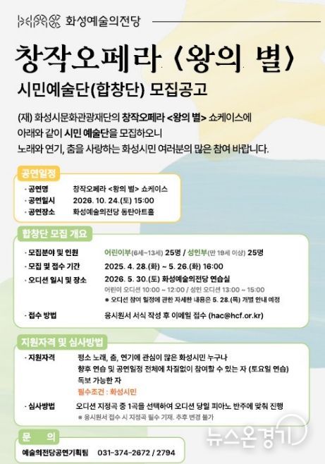 뉴스온경기 | (재)화성시문화관광재단은 오는 10월 개최 예정인 창작오페라 '왕의 별' 쇼케이스 무대에 참여할 시민합창단을 모집한다.