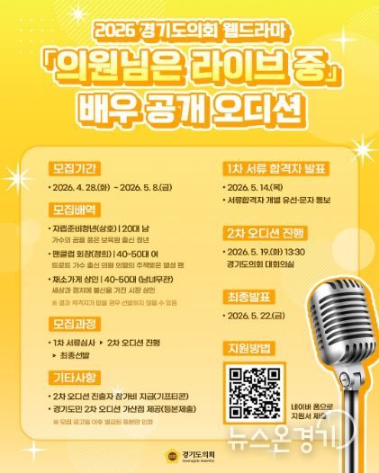 뉴스온경기 | 경기도의회는 2026년도 경기도의회 웹드라마 ‘의원님은 라이브 중(가제)’에 출연할 배우를 공개 모집하기 위해 오디션을 개최한다.