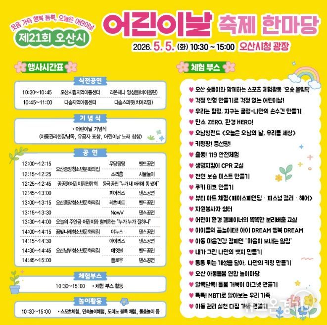 행사장에서는 오산시립지역아동센터 라온제나 앙상블과 다솜지역아동센터 다솜스피릿의 식전 공연을 시작으로 어린이날 기념식이 열린다. 이어 아동권리다짐 가방 만들기, 키링 만들기, 쿠키 만들기 등 다양한 체험부스가 운영된다.