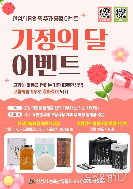 뉴스온경기 | 안성시는 오이데이와 5월 가정의 달을 맞아 고향사랑기부제 참여 확대와 지역 농산물 소비 촉진을 위해 ‘오이데이 이벤트’와 ‘가정의 달 이벤트’를 추진한다고 밝혔다.