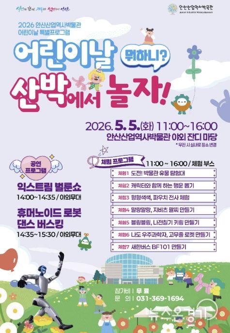뉴스온경기 | 안산시는 내달 5일 어린이날을 맞아 안산산업역사박물관에서 어린이날 특별프로그램 ‘어린이날 뭐하니? 산박에서 놀자!’를 개최한다고 29일 밝혔다.