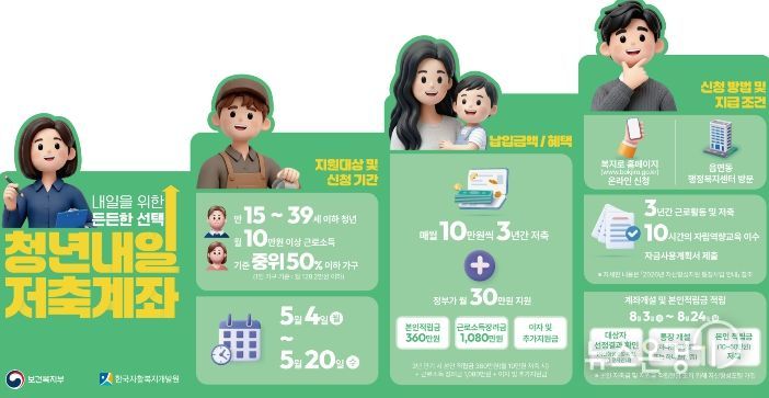 '청년내일저축계좌'가입 대상은 신청 당시 근로중인 만 15세 이상 ~ 만 39세이하 청년 중 근로·사업소득이 월 10만원 이상이고, 청년이 속한 가구의 소득인정액이 기준 중위소득 50% 이하여야 한다.