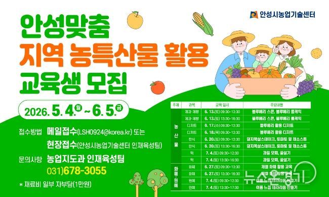 뉴스온경기 | 안성시농업기술센터는 지역 농산물을 활용한 실습 교육을 통해 소비를 촉진하고 ‘지산지소(지역에서 생산된 농산물을 지역에서 소비함)’ 문화를 활성화하고자, 오는 5월 4일부터 6월 5일까지 교육생을 모집한다고 밝혔다.