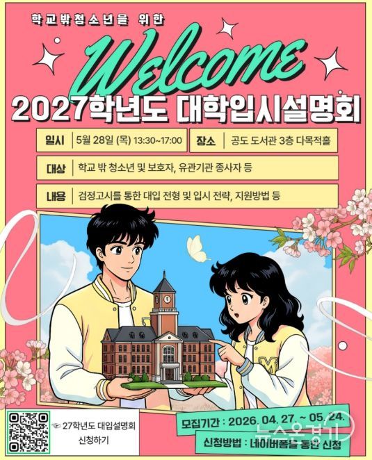 뉴스온경기 | 안성시학교밖청소년지원센터는 학교 밖 청소년의 성공적인 진학을 돕기 위해 오는 5월 28일 오후 1시 30분부터 공도 도서관 다목적홀에서 ‘2027학년도 대학 입시 설명회’를 개최한다고 밝혔다.