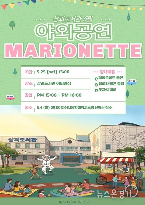 뉴스온경기 | 화성시립 삼괴도서관은 5월 가정의 달을 맞아 오는 5월 23일, 도서관 야외광장에서 가족 단위 이용자를 위한 특별한 문화행사를 운영한다. 따뜻한 봄날의 야외 공간에서 누구나 편안하게 즐길 수 있도록 마련된 이번 행사는 도서관을 찾는 시민들에게 색다른 문화 경험과 여유로운 시간을 제공할 예정이다.