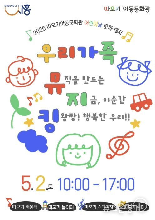 뉴스온경기 | 시흥시 따오기아동문화관은 어린이날을 맞아 오는 5월 2일 오전 10시부터 오후 5시까지 따오기아동문화관 야외 일대에서 2026년 어린이날 문화행사 ‘우리가족 뮤지킹’을 개최한다.
