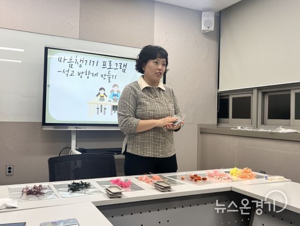 이번 회기에는 ‘마음챙김 미술요법’으로 힐링원예치료센터 전문 외부 강사를 통해 아로마 향기로 심신을 안정시키고 본인에게 맞는 향을 선택해 꽃을 이용한 인테리어 소품(석고방향제)을 만드는 시간을 가졌다.