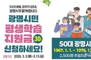 뉴스온경기 | 광명시가 50대 중장년 시민의 배움 기본권 보장을 위해 올해도 평생학습지원금 지원을 이어간다. 시는 오는 3월 3일부터 13일까지 11일간 ‘2026년 광명시민 평생학습지원금’ 신청을 받는다고 26일 밝혔다. 광명시민 평생학습지원금은 생애 전환기를 맞은 50대 시민이 나이·소득·배경과 관계없이 배움을 지속할 수 있도록 생애 1회 1인당 30만 원의 평생학습이용포인트를 지원하는 사업이다. 시민 스스로 자신의 삶과 필요에 맞는 학습을 선택하도록 돕는 것이 핵심 목적이다. 박승원 광명시장은 “배움은 선택이 아닌 누구에게나 보장돼야 할 기본권”이라며 “시민이 나이나 환경의 제약 없이 언제든지 배움을 이어갈 수 있도록 평생학습 기반을 더욱 탄탄히 만들어가겠다”고 밝혔다. 신청 대상은 1967년 1월 1일부터 1976년 12월 31일 사이에 출생한 50대 광명시민이다. 광명시에 1년 이상 계속 거주했거나, 거주기간을 합산해 5년 이상 거주하고 있어야 한다. 시는 총 2천500명을 선정해 지원한다. 59세(1967년생)는 올해가 마지막 지원 대상임을 고려해 우선 선정하고, 1968~1
